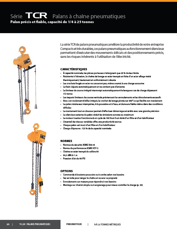 La série TCR de palans pneumatiques améliore la productivité de votre entreprise. Compacts et très durables, ces palans pneumatiques au fonctionnement silencieux permettent d'exécuter des mouvements délicats et des positionnements précis, sans les risques inhérents à l'utilisation de l'électricité.